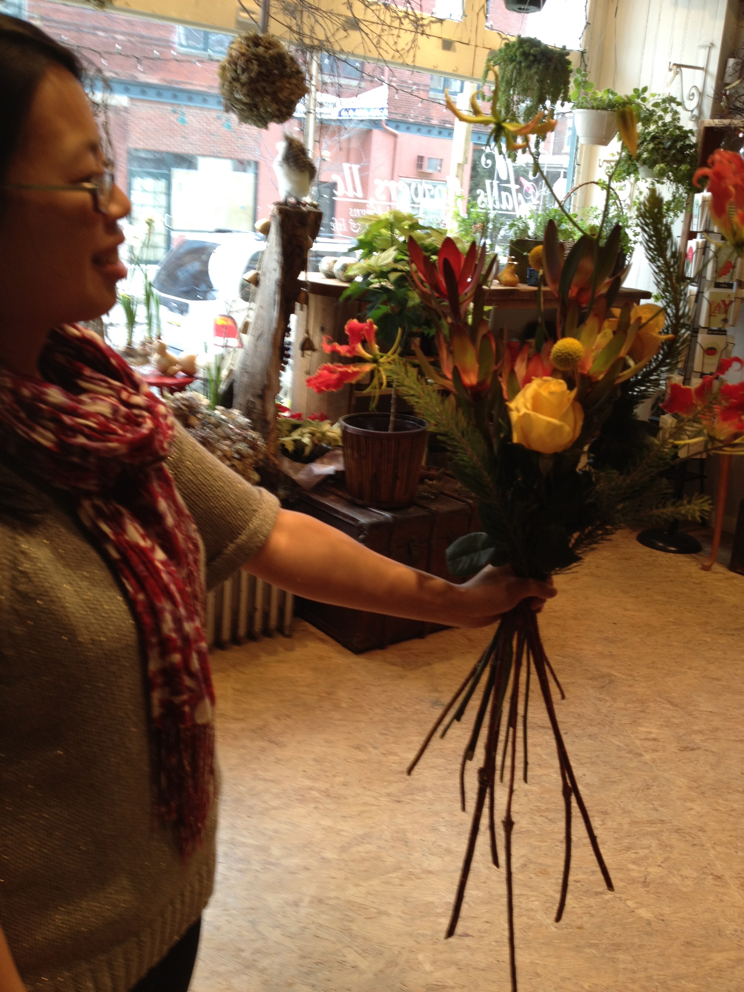 The proprietor, Peicha Chang, gets her flowers from a variety of Philly vendors, who get their stuff from NYC or local growers when possible, and the NYC flowers come from Holland, Japan, South America, and beyond. For Christmas and Easter, she’ll go up to the NYC flower market herself. I guess there’s no way around being slightly uncomfortable at the environmental impact shipping flowers all over the world has, and if there were a way to stock only locally grown flowers, she would be doing this, but for the kind of variety she wants it’s just impossible. Not sure how I feel about this part of the industry, as flowers are not a ‘necessity,’ really. It would at least be nice to know if the farms that are growing your flowers are growing them sustainably, not just for the soil’s sake but for the workers and their exposure to chemicals. More on this later as I dig deeper.