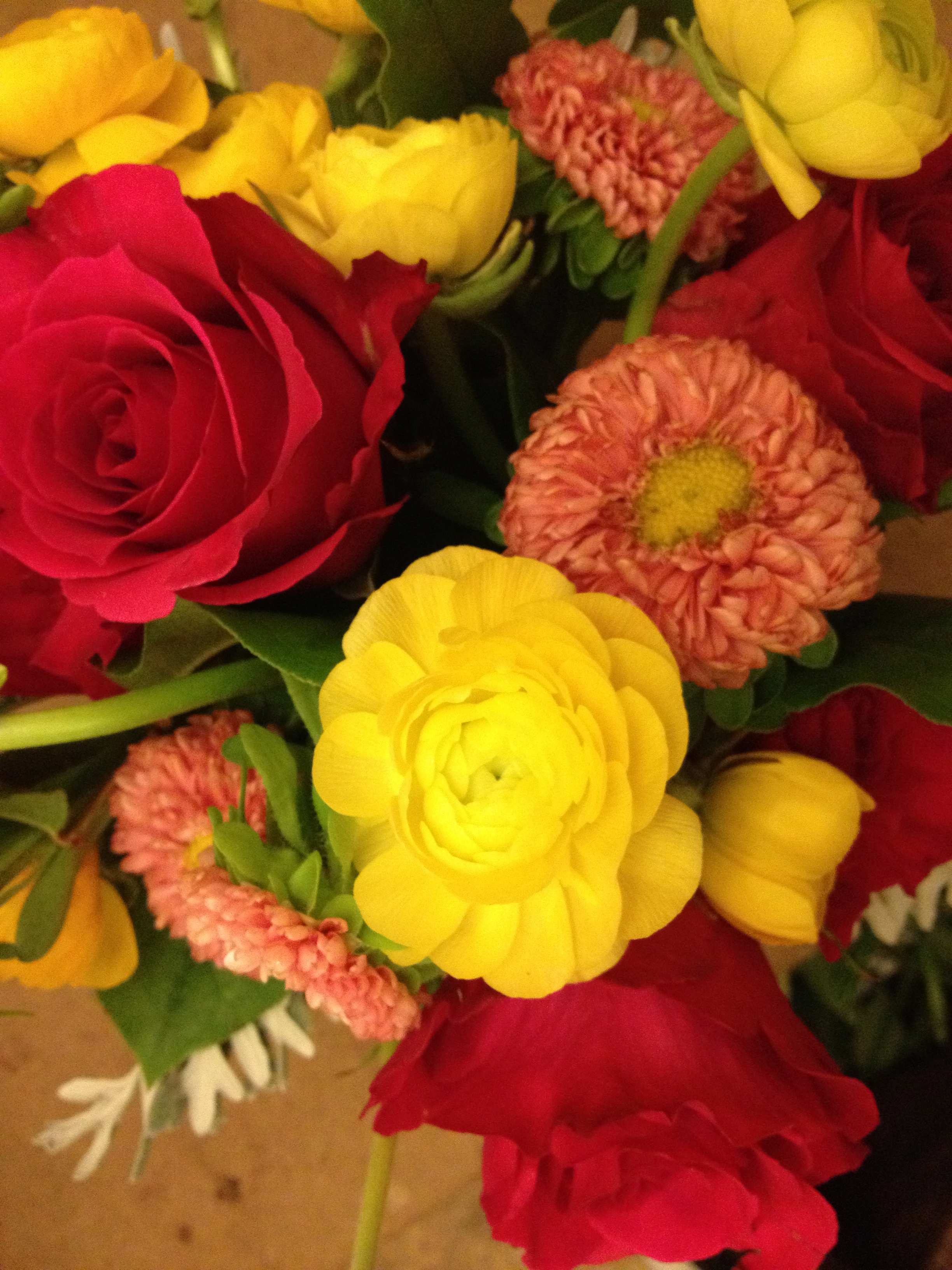 Okay, want to see how it’s done? Check out what Peicha did here for this bright and cheerful birthday arrangement. Oh it happened pretty quickly, her hands darting in and out of the display vases, measuring the stems against the container, and knifing the stems down to size so fast I couldn’t even capture the process. The final result, a delight in reds and yellows, is here: