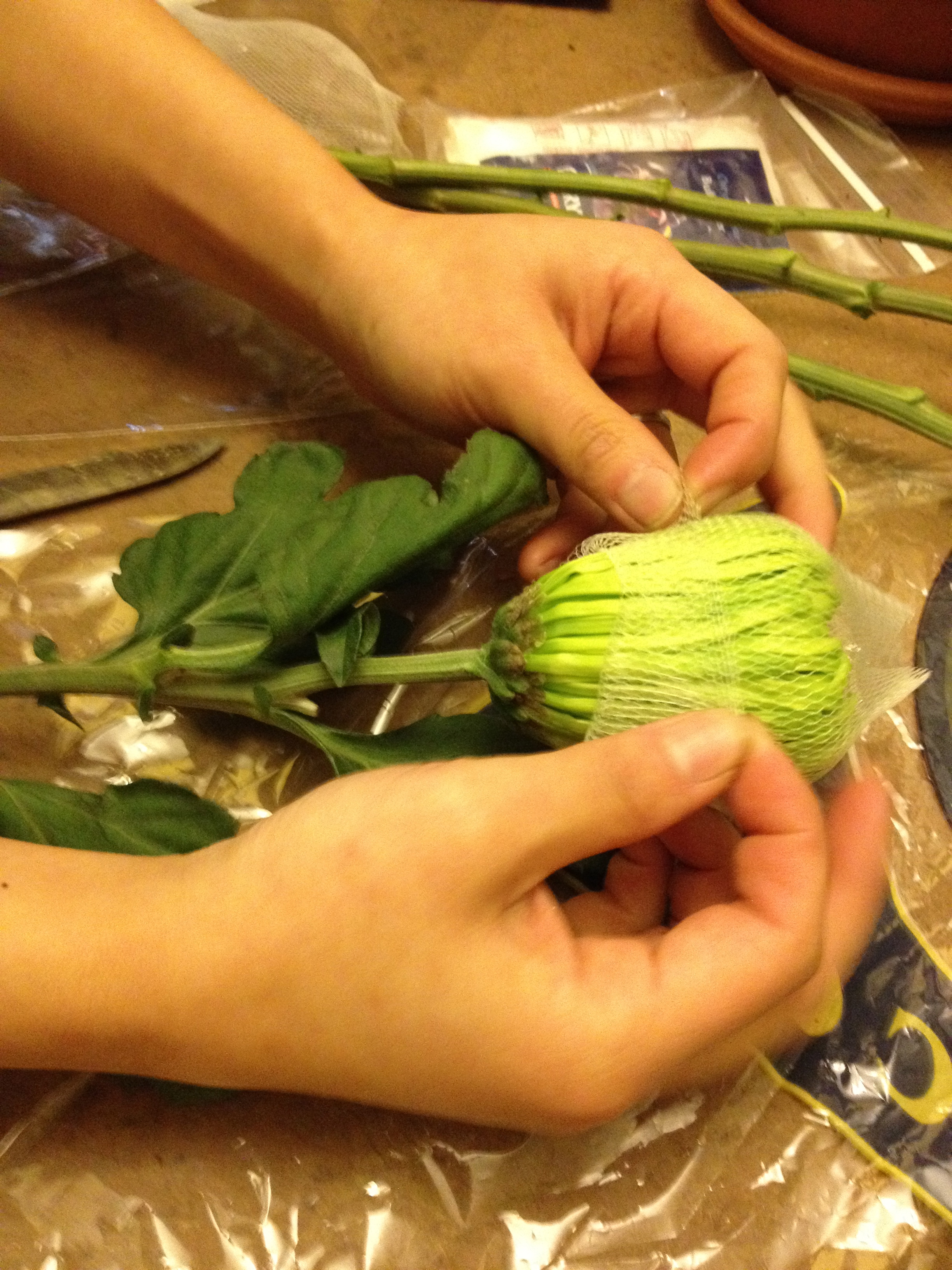 These big chartreuse babies are Spider Mums and like other blooms with fat heads, they come with their own mini nets to secure and protect them. DON’T JUST TEAR THE NETS OFF WILLY NILLY. I learned that taking the nets off should be the last step before you set them into their container, and don’t rush it. BE GENTLE – just peel the net up and over the bloom so your mum isn’t decapitated and the petals remain intact.