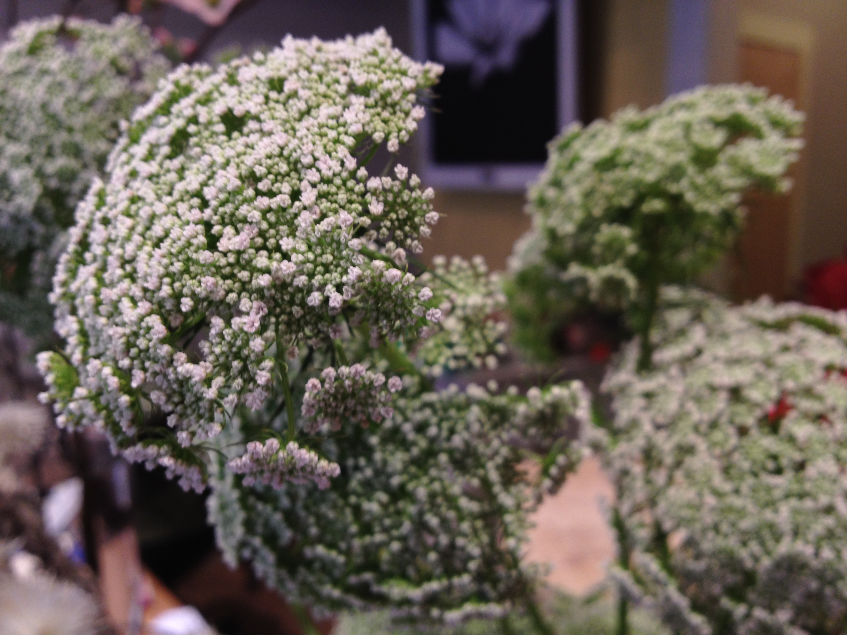 Interestingly enough, WHITE is NOT a neutral color in arranging. I learned this the hard way in a lesson towards the end of the day when I created my own bouquet…uh oh…no picture means it wasn’t too great! If you’re using whites, Peicha says choose only one other color family. I used the green mums, some pinky-yellows, some deep rosy reds, AND white…too much! But I’m learning, I’m learning. I think I just couldn’t resist using the Queen Anne’s lace, because though it’s a European introduction and considered a weed by many, it’s a wildflower at the very top of my list. I love it’s lacy umbels of green and white – these had just come in and were so tight (come back later when they’re fully opened!)