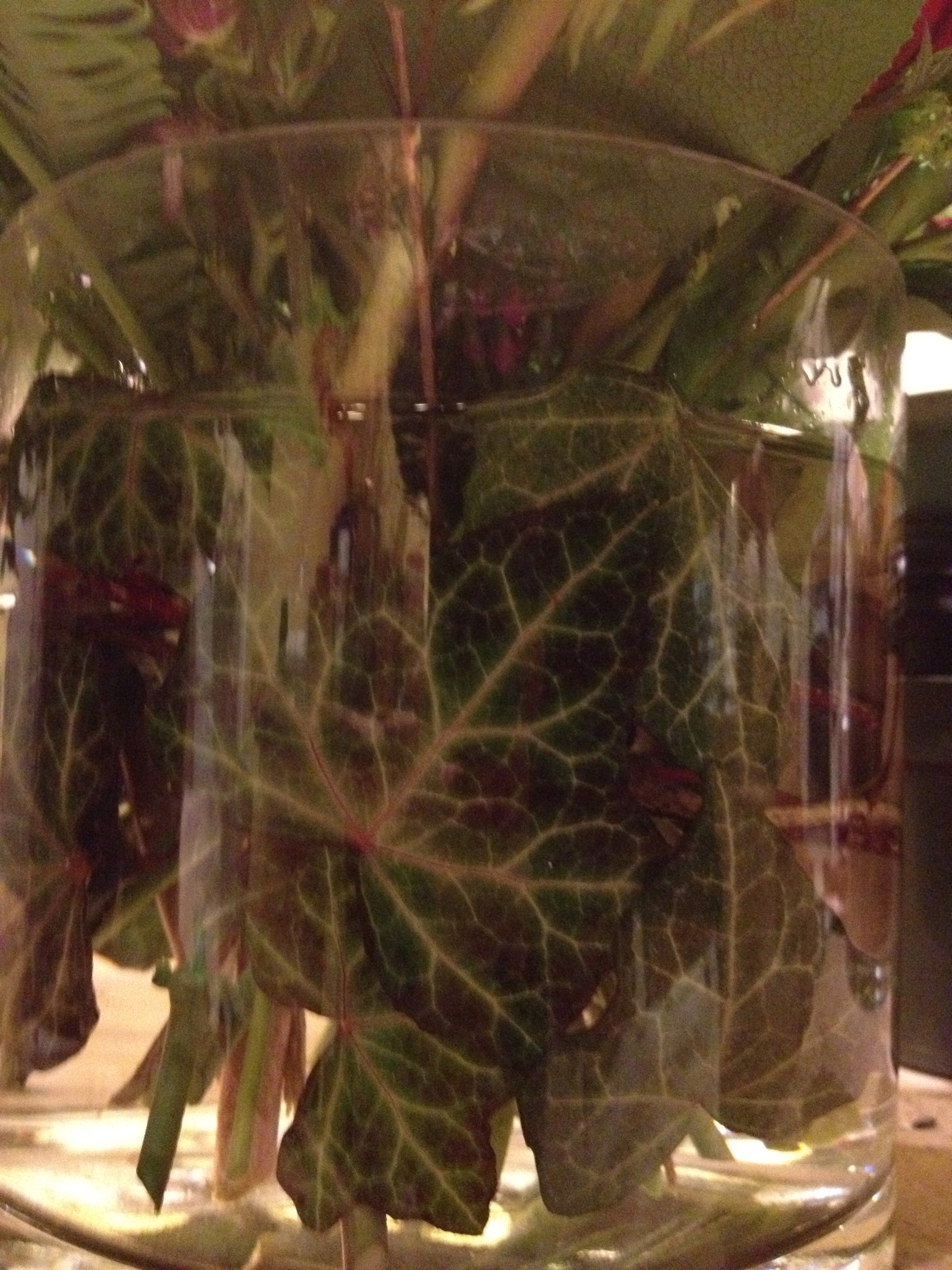 After she was happy with the first centerpiece, using bright purples, dark pinks and solid reds coupled with light and dark greens; she cranked out the others (I think there were around 25.) Each centerpiece is slightly different when you look closer; some have darker tulips, some have hypericum berries, etc. But you’ll have to wait until they’re in their proper setting to really see them.  I watched her work, as miraculous creation took place, one beautiful arrangement after the next.