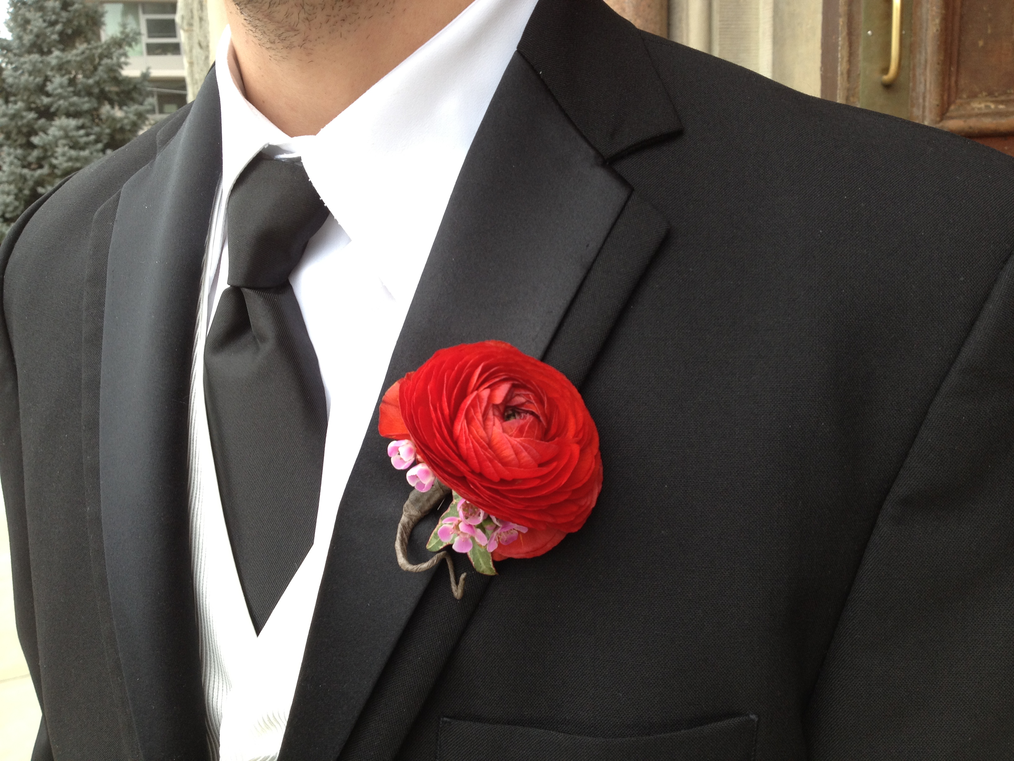 Now for Saturday, the big day…I arrived at work very excited to see what was in store.  While Peicha finished the bouquets for the ladies, I was given a surprising task – delivering the personal flowers to the groom’s side of the family.  The groom was calm and happy as I showed him how to pin his flowers on.  Here, the best man models his boutinnière comprised of red ranunculus, waxflower and ivy.