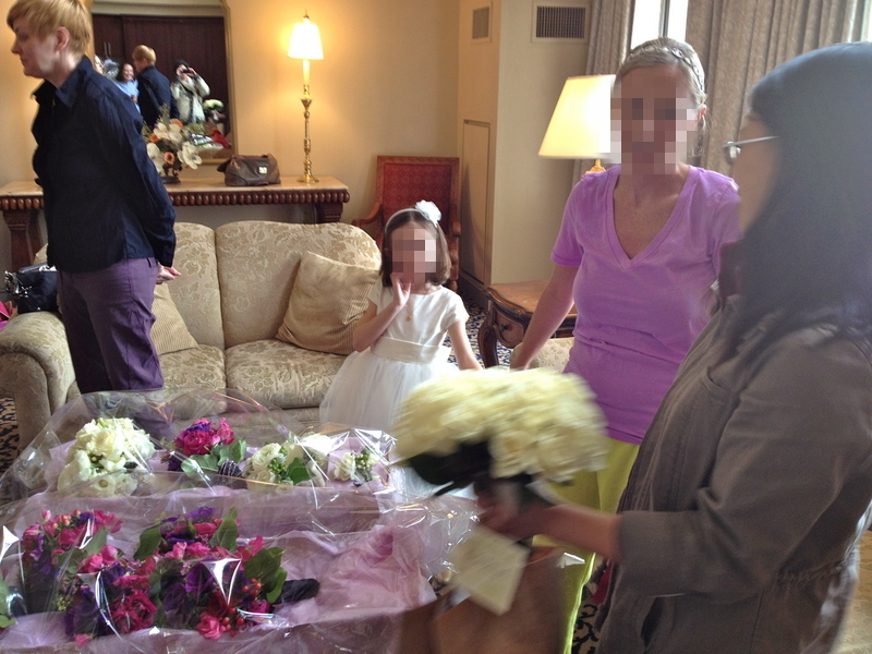 Then Peicha and I hit the road to deliver the bridal flowers.  Arriving at the Omni Hotel, everyone right down to the valet was happy to see us…well, maybe it was the flowers they were happy to see.   And after all her intense hours of labor, this is payoff day for Peicha – will the bride be happy? Will everything go off without a hitch?