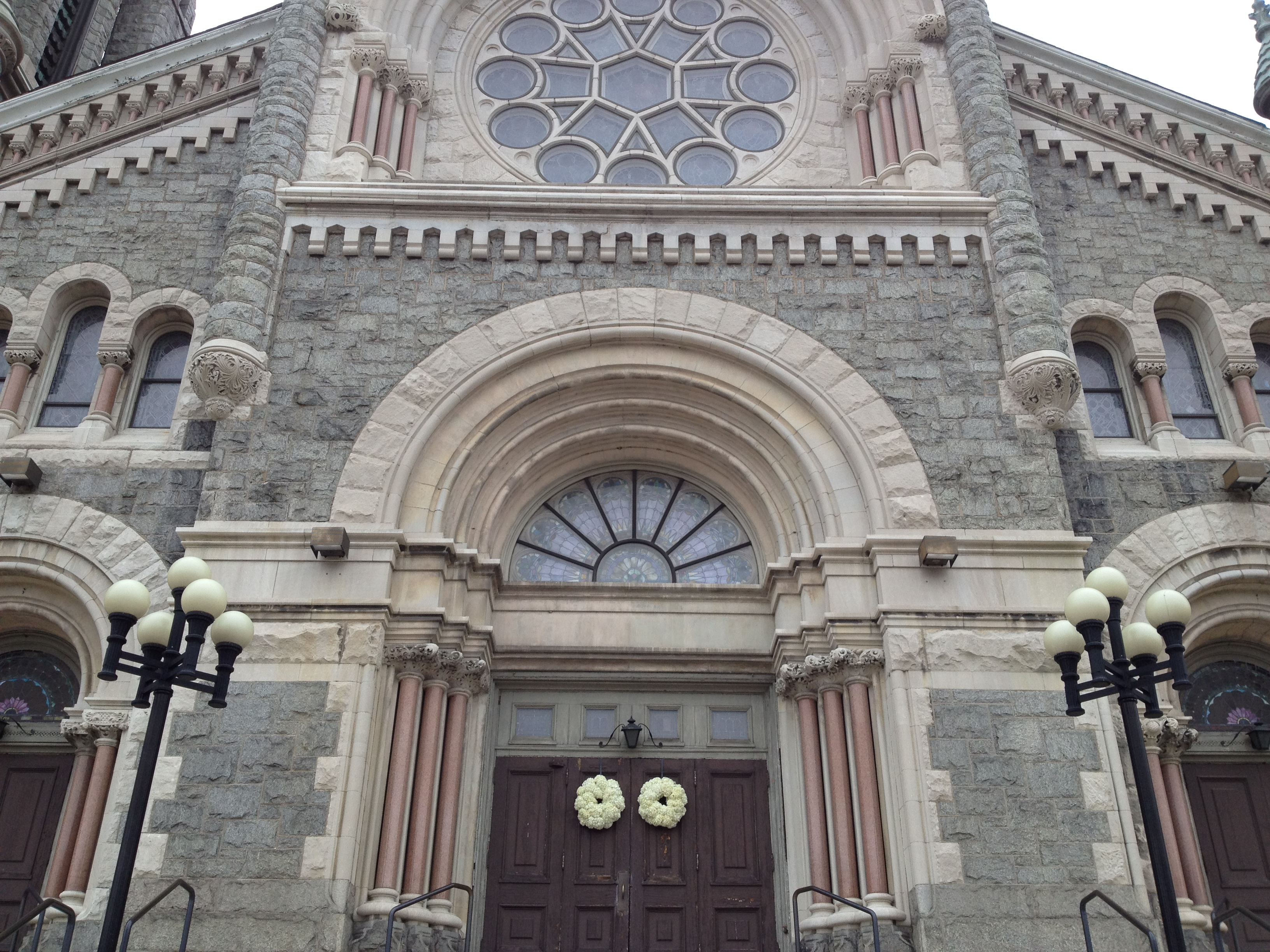 church wreaths with the team at falls flowers Published February 6, 2012 at 3264 × 2448 in winter wedding hydrangea wreaths on a beautiful church! (with team at falls flowers) 39.965833 -75.177000