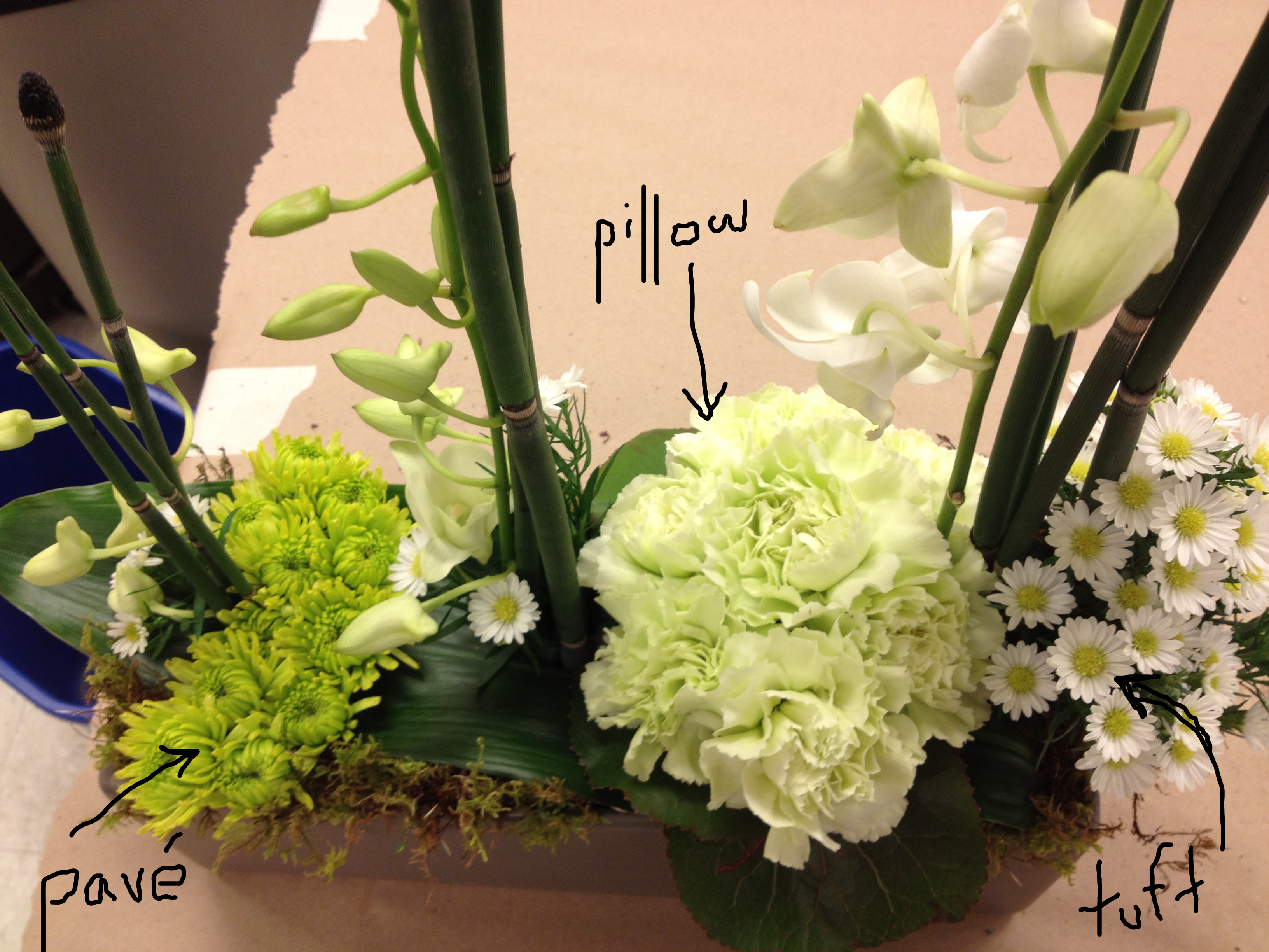 Next, we did our basing techniques to cover the mechanics and to create color and texture. Pillowing is creating a tight, round pillow out of a few stems placed radially. Tufting uses bunches of short stems to create an airy look. Pavé-ing is a tight clustering technique where the surface of the bunches remains totally flat, creating a cobblestone effect. (Pavé as in the jewelry technique, too.)