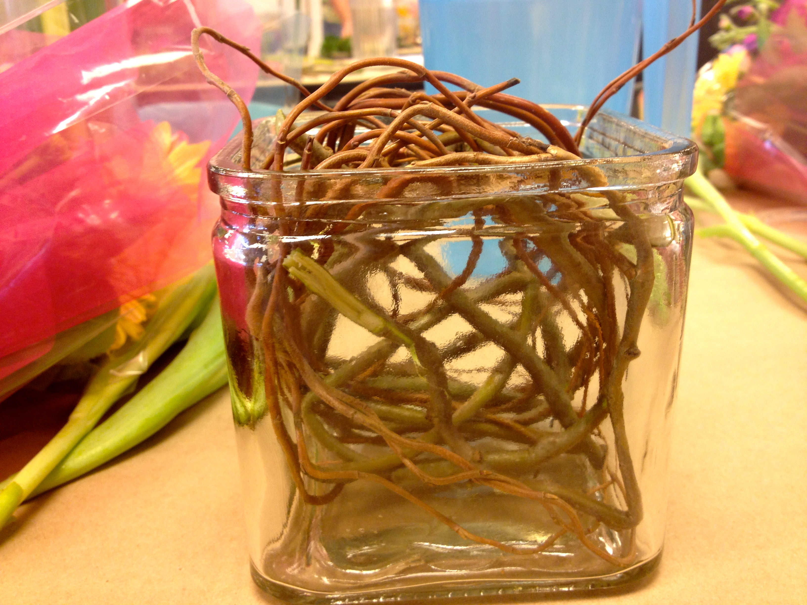 The second, and the one I went for as it would create interest in the lower half of the arrangement, was the branch structure with willow. Wrap a stem of curly willow around your hand and smush it into the glass, adding a few big stems in a criss cross pattern for more support, and 2-4 more wrapped stems as needed. You could use any other flexible stems for this, like red stemmed dogwood for example. Just make sure they’re pretty bendy.