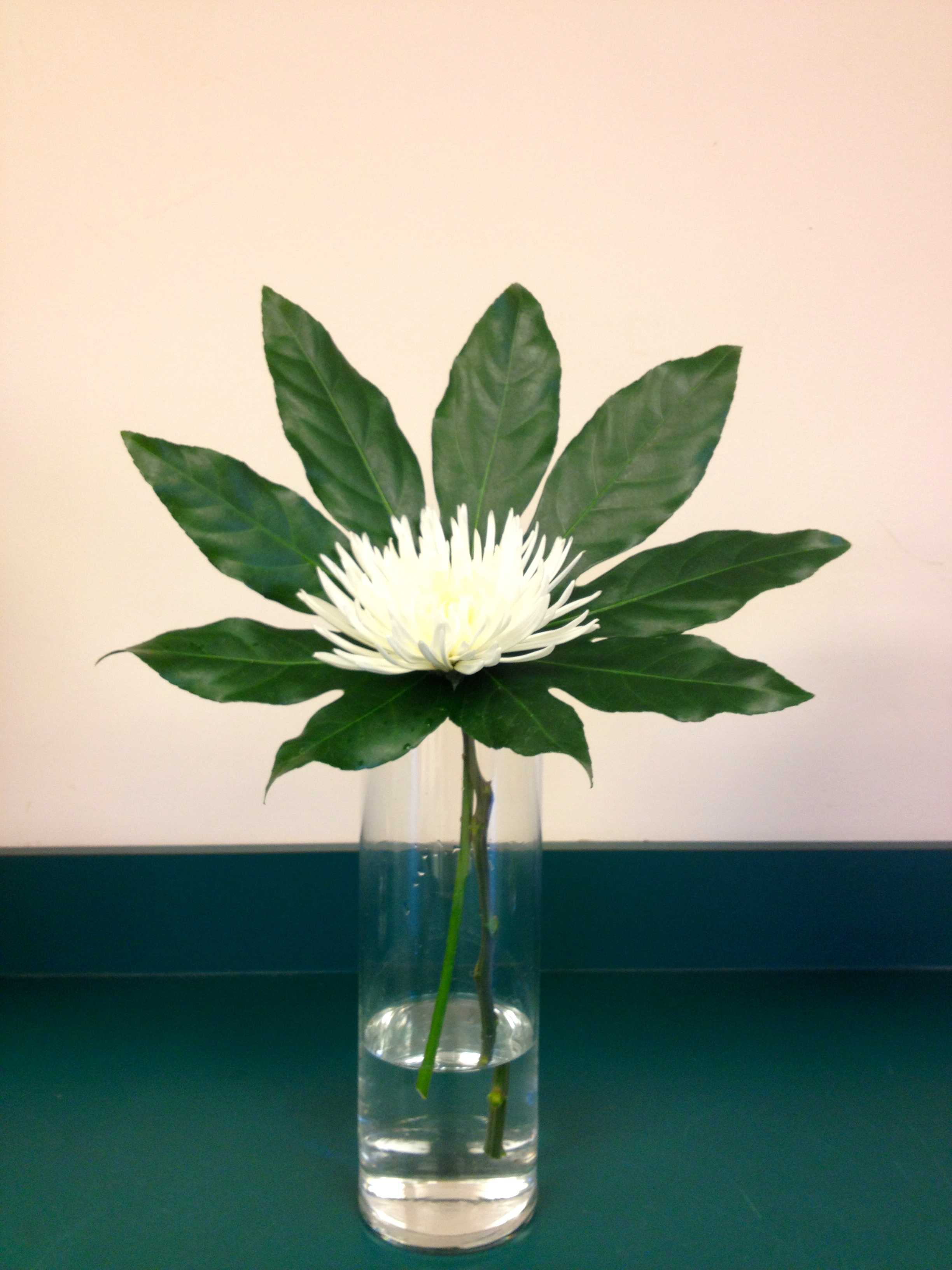 Moving on, we are to create Design 2 – a Linear design with an invisible/imaginary axis. We have a nice white Ikea vase to play with. Again, we make a sketch and plan all the elements: dominant element, flower forms, palette, and where is the imaginary vertical axis. All I know is, I’m using those Bells of Ireland (I will have to wire them to make them the shape I want) and green mums, and my imaginary axis will be in the center. I want to do something curvy.