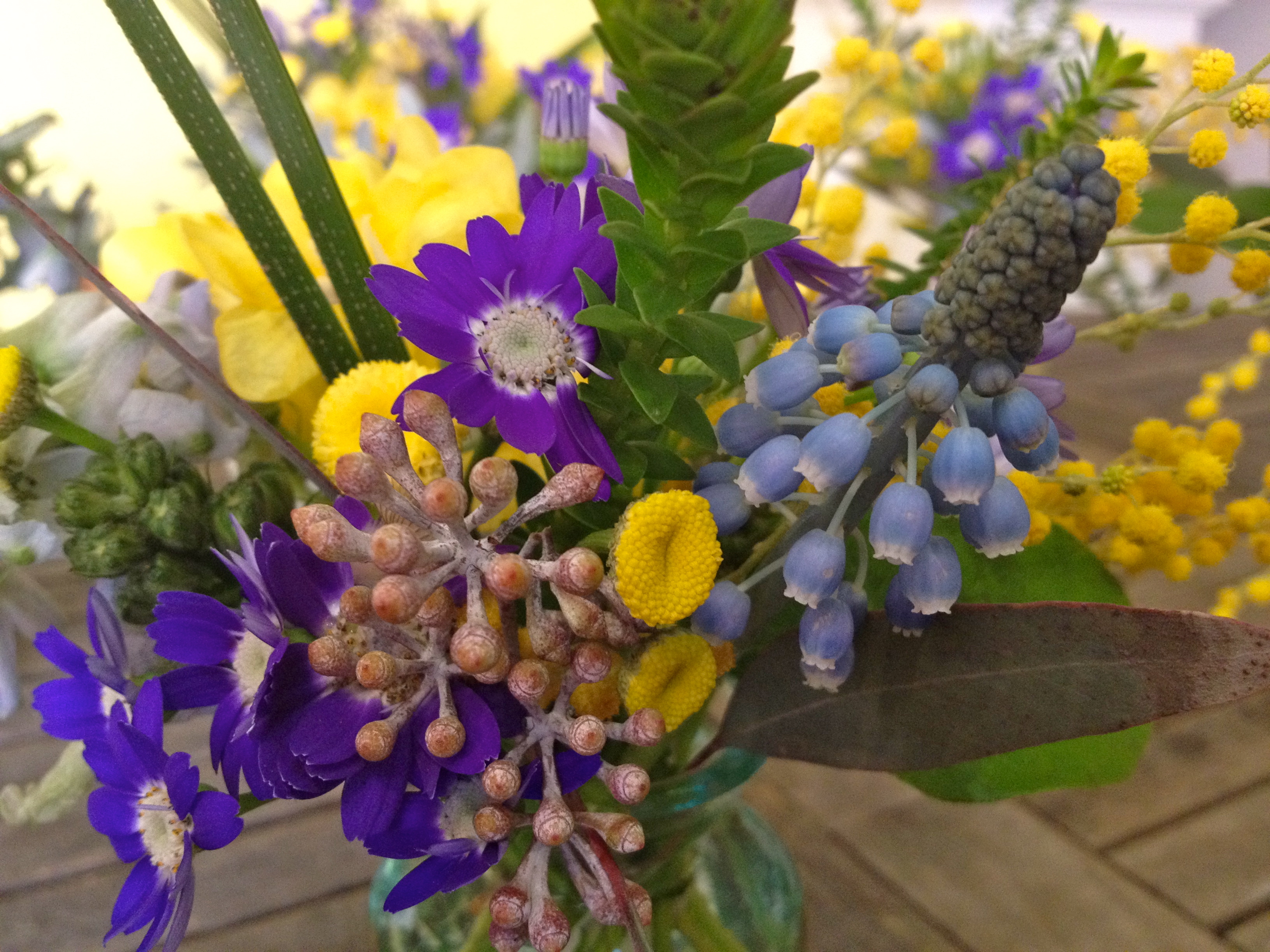 Last week at falls flowers, Peicha gave me the go-ahead to design some mini arrangements for a baby shower. The baby on the way is a boy! So mom opted for all blues and yellows. I had a blast doing these! I used a huge variety of material including but not limited to: muscari, acacia, freesia, fritillaria, delphinium, seeded eucalyptus, cineraria, scabiosa seedpods, and dusty miller.