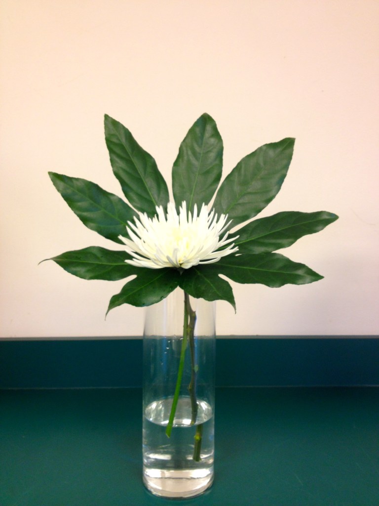 IMG_2221 Published March 25, 2012 at 2448 × 3264 in day six – basic floral design I at longwood – last day of basic! this very simple design using a mum and a aralia leaf reminds me of a lotus 39.873000 -75.680333