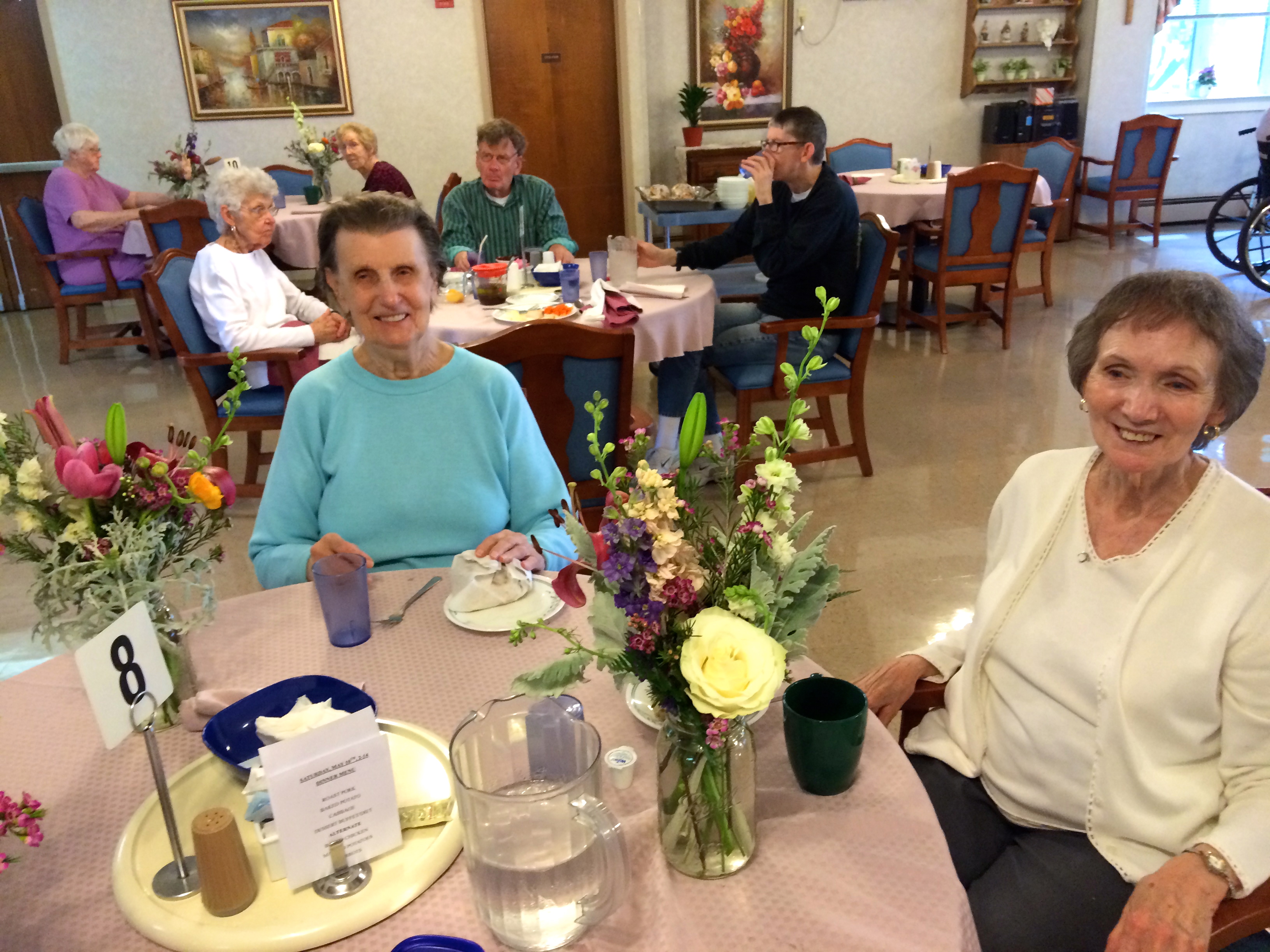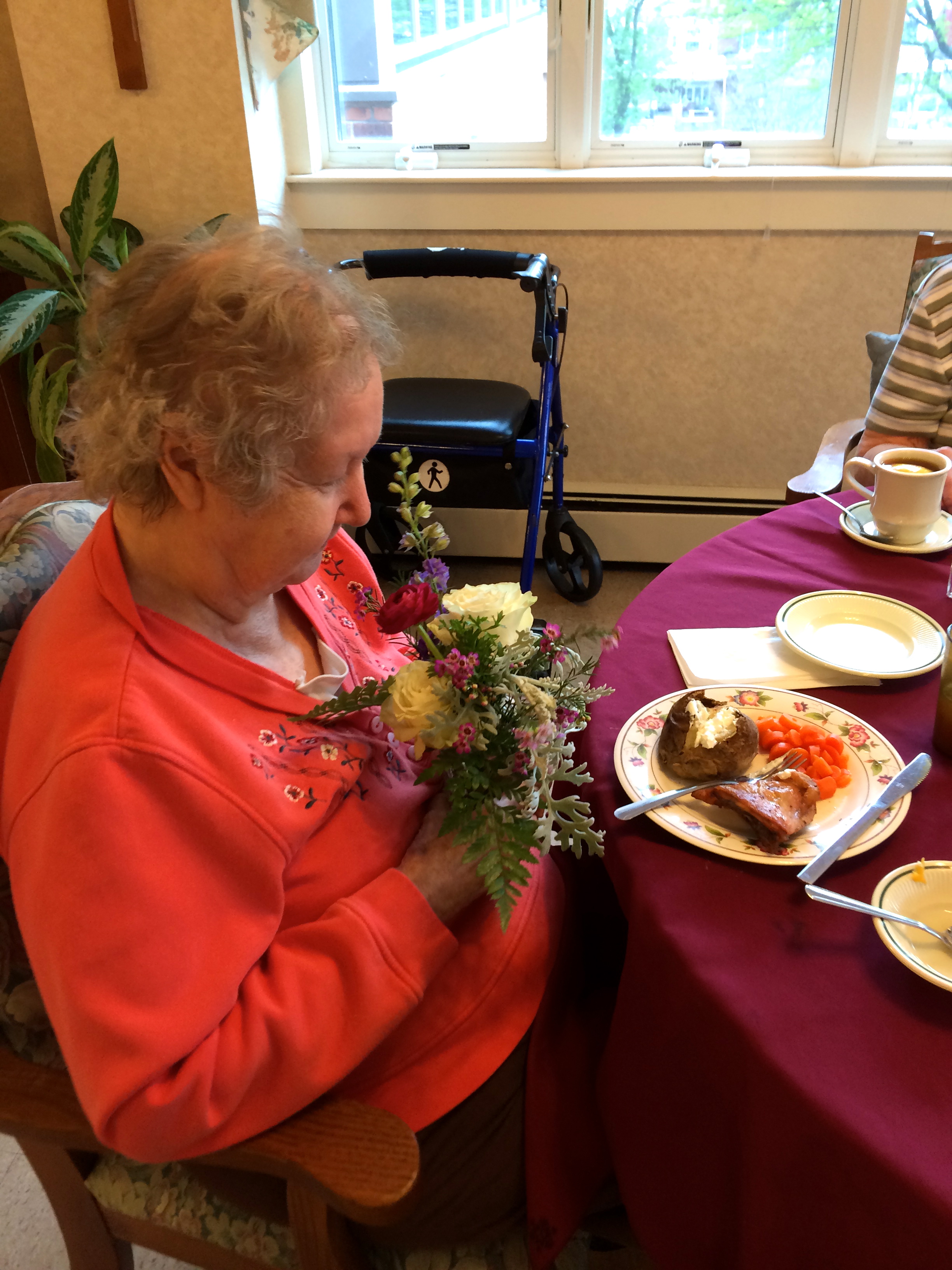 When we arrived we were greeted by the smiling faces of the Sisters of the Poor, including Elizabeth Ann who hails from the Boston area.  She got us carts and we made the trip up the elevator to stop at every floor and give out our floral jars to the residents while they were eating lunch.