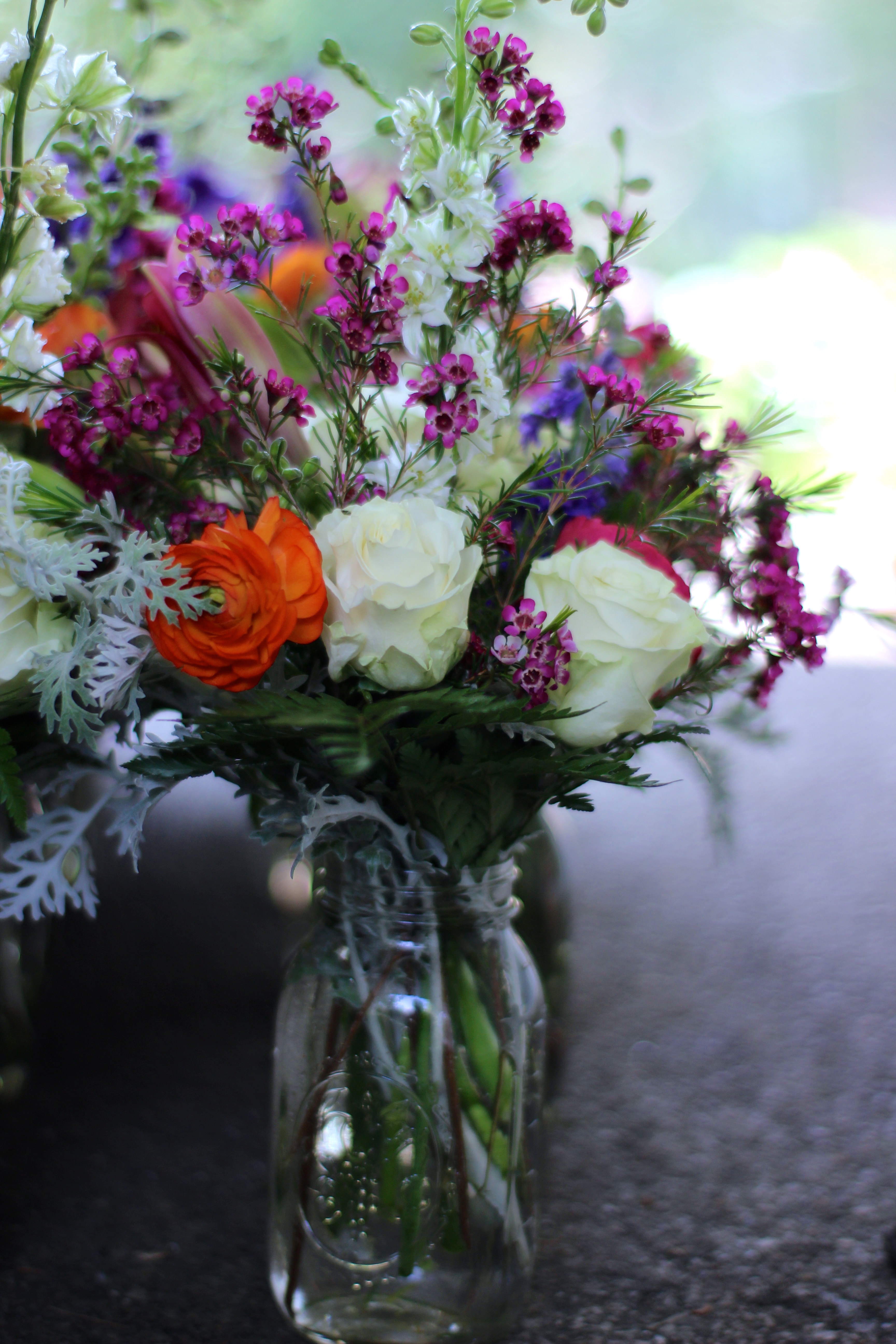 Finished “jars of love” ready to be delivered: lilies, larkspur, ranunculus, roses, waxflower